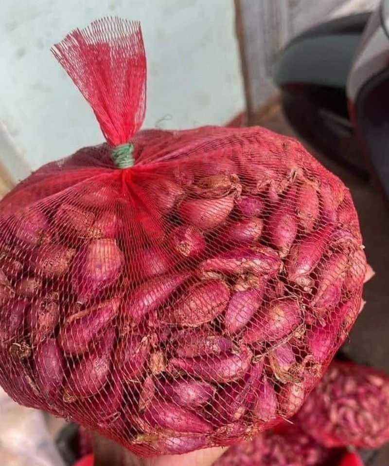 | Hành sau khi phơi sấy khô sẽ được cho vào lưới để xuất bán |