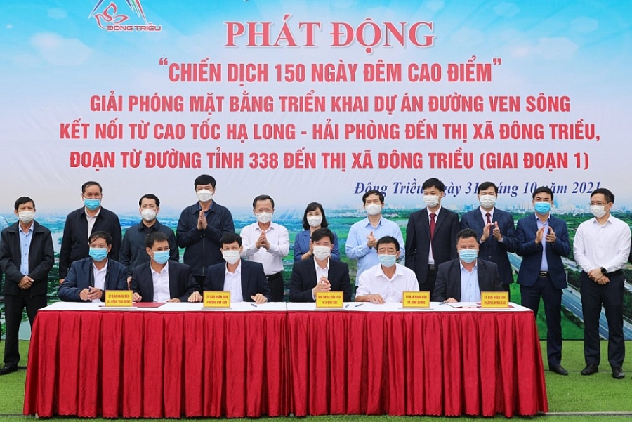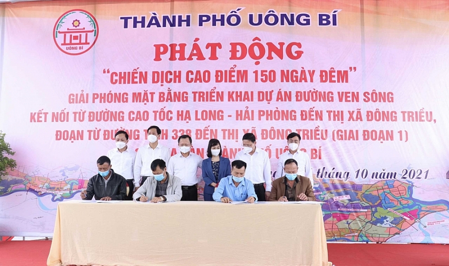 Tại lễ phát động, đại diện các đơn vị liên quan của TP Uông Bí và TX Đông Triều đã ký kết chương trình phối hợp, triển khai Chiến dịch cao điểm 150 ngày đêm” GPMB đường ven sông. Đại diện các hộ dân có đất trong diện ảnh hưởng cũng ký cam kết bàn giao sớm mặt bằng.