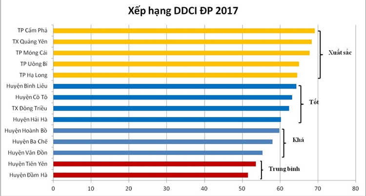 Kết quả, 5 địa phương đứng đầu bảng xếp hạng DDCI trong năm 2017 theo thứ tự từ thứ nhất đến thứ năm là: TP. Cẩm Phả, thị xã Quảng Yên, TP. Móng Cái, TP. Uông Bí và TP. Hạ Long. Xét riêng chỉ số thành phần trách nhiệm người đứng đầu ba địa phương xếp nhóm đầu theo thứ tự bao gồm: TP. Móng Cái, TP. Hạ Long, huyện Ba Chẽ (xem bảng dưới).
