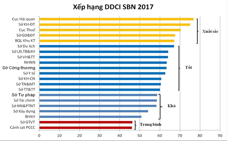 Đối với các sở, ngành, có 5 sở, ban, ngành xếp đầu bảng xếp hạng DDCI, theo thứ tự từ thứ nhất đến thứ năm là: Cục Hải quan, Sở Kế hoạch và Đầu tư, Cục Thuế, Sở Giáo dục và Đào tạo, Ban Quản lý khu kinh tế. Về chỉ số thành phần trách nhiệm người đứng đầu ba đơn vị xếp nhóm đầu theo thứ tự bao gồm: Cục Hải quan, Sở Tài chính, Sở Tài nguyên Môi trường (xem bảng dưới).