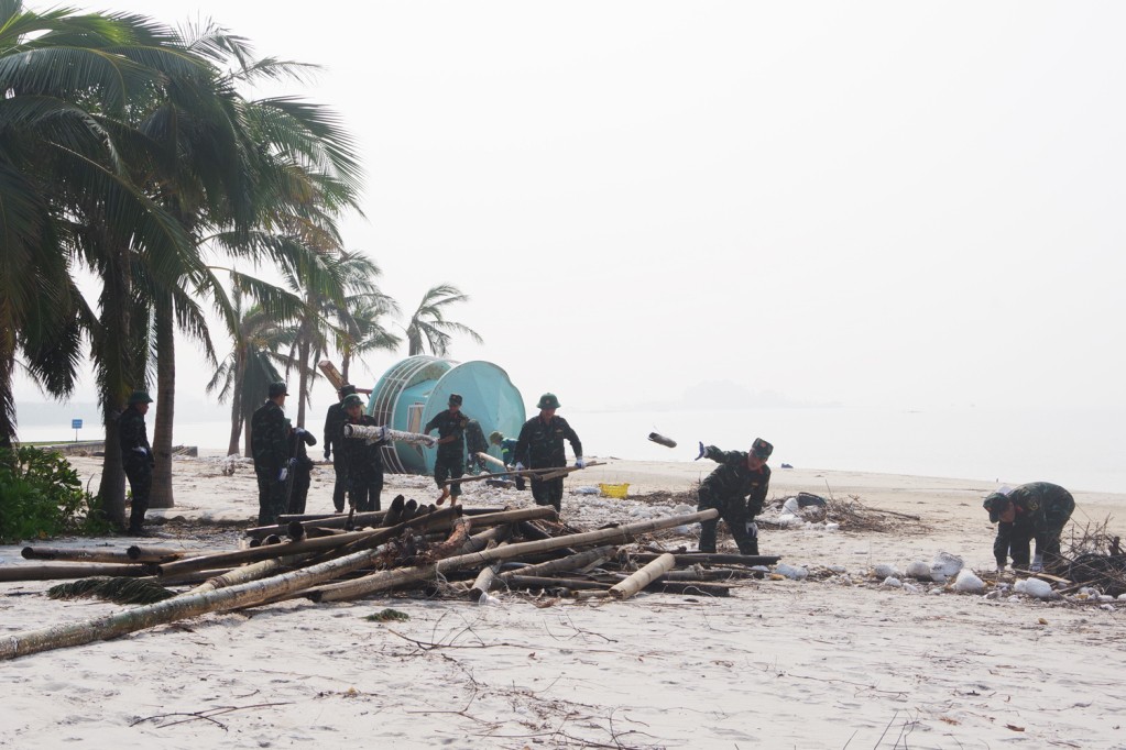 | Bộ CHQS tỉnh đã huy động 260 cán bộ, chiến sĩ cùng các trang thiết bị, phương tiện phối hợp với Ban Quản lý vịnh Hạ Long thu gom rác trên mặt biển và các chân đảo |