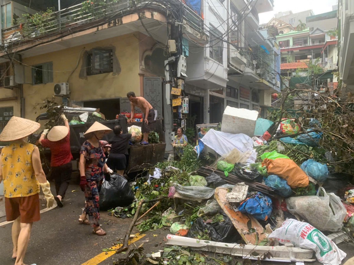 | Ngay khi sáng sớm, người dân đã đổ ra đường dọn dẹp rác thải sau bão |
