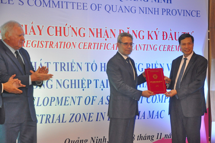| Đồng chí Đức Long - Phó Bí thư Tỉnh ủy, Chủ tịch UBND tỉnh Quảng Ninh (phải) - trao giấy chứng nhận đăng ký đầu tư cho doanh nghiệp nước ngoài |