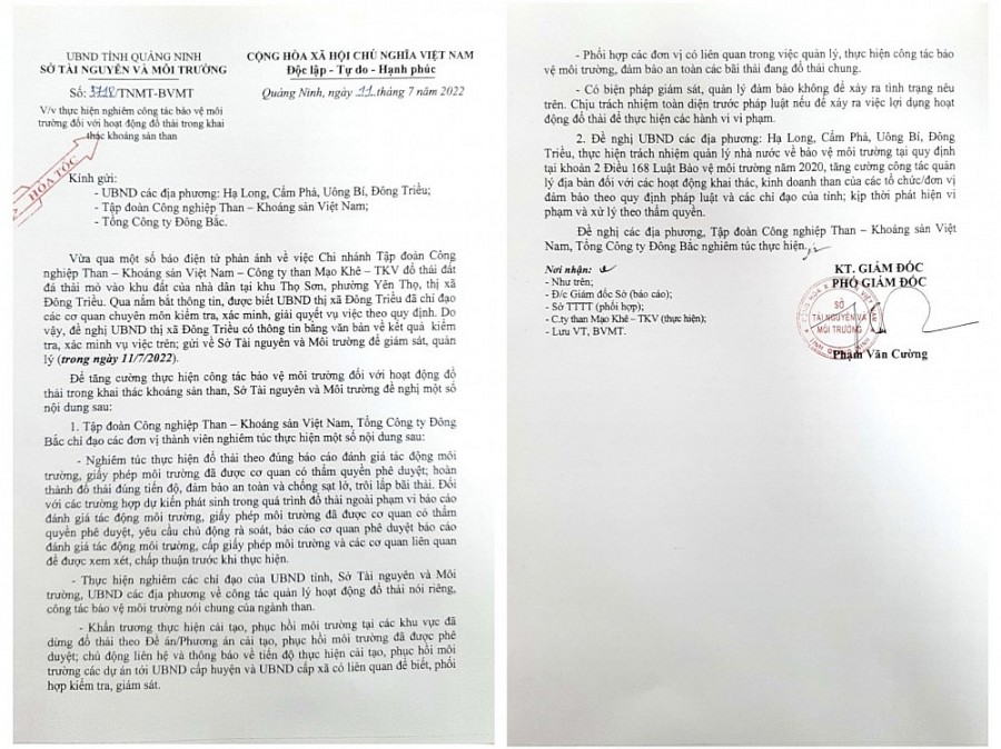 Sau khi có phản ánh của báo chí, trong đó có Báo Công Thương, ngày 11/7/2022, Phó Giám đốc Sở Tài Nguyên và Môi trường tỉnh Quảng Ninh Phạm Văn Cường đã ký Văn bản số 3718/TNMT-BVMT gửi đến các địa phương, doanh nghiệp gồm: Hạ Long, Cẩm Phả, Uông Bí, Đông Triều, Tập đoàn Công nghiệp Than – Khoáng sản Việt Nam; Tổng Công ty Đông Bắc yêu cầu thực hiện nghiêm công tác bảo vệ môi trường đối với hoạt động đổ thải trong khai thác khoáng sản than.