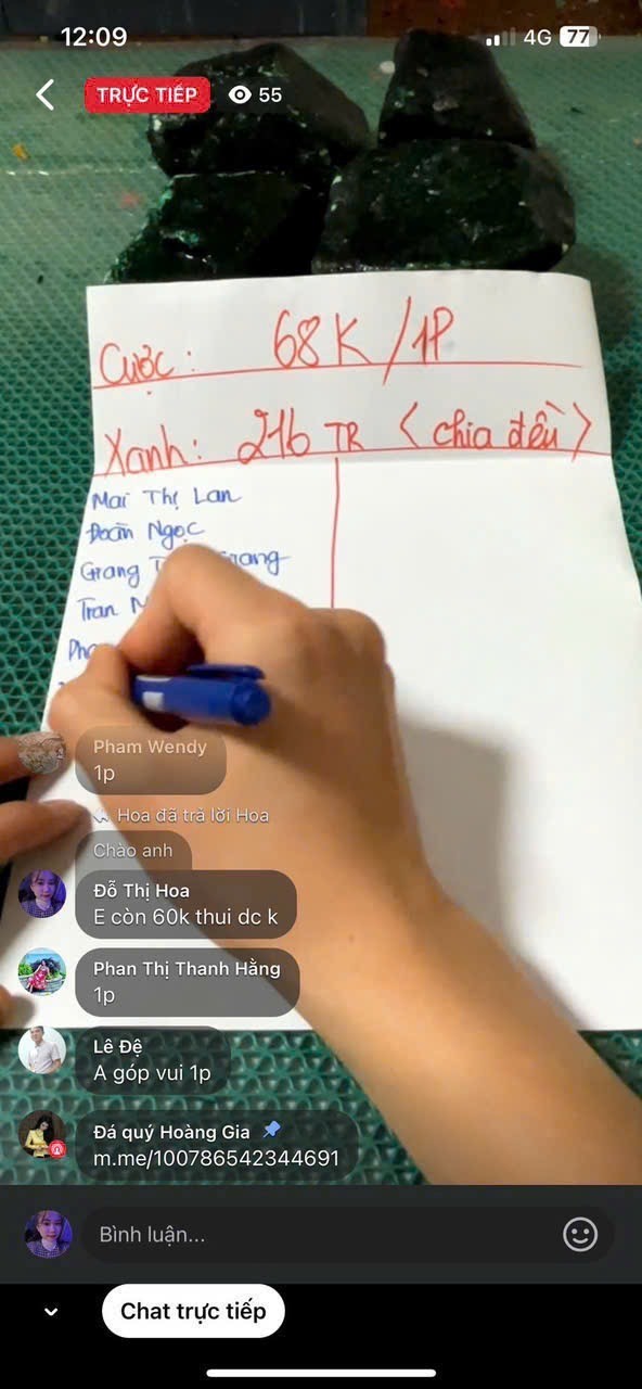 Đối tượng Vũ Văn Hải khai nhận: “Một nhóm của chúng tôi sẽ có 4 người, một người Trung Quốc phụ trách quản lý và cắt đá, tôi phụ trách công việc gửi số điện thoại để nhận tiền của khách. Khi đảm nhiệm công việc livestream gọi khách vào chơi còn anh Cảnh sử dụng chiếc điện thoại di động để bình luận tham gia chơi giống như những người khách chơi để tạo niềm tin cho những người chơi khác”.