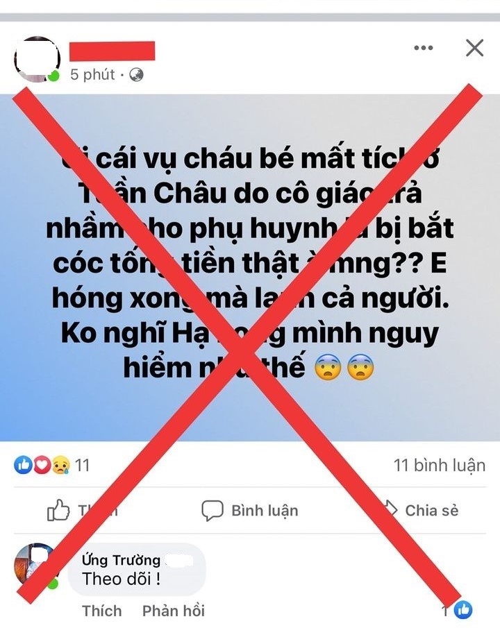 Thế nhưng, từ chiều 2/10, một số tài khoản mạng xã hội chưa kiểm chứng thông tin đã lan truyền tin giả lên mạng xã hội và cho rằng vụ việc trên là bắt cóc đòi tiền chuộc. Có tài khoản còn nói "đối tượng đòi 15 triệu đồng".