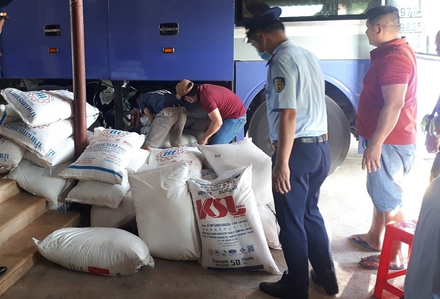Quá trình khám phương tiện phát hiện có 2 loại hàng hoá là: 1.500kg đường kính trắng loại 50 kg/bao do Thái Lan sản xuất và 1.920 chai bia Heineken loại 250ml/chai, 5%vol do Pháp sản xuất được cất giấu tinh vi, che đậy bởi các túi hành lý của hành khách. Toàn bộ hàng hoá trên không có hoá đơn chứng từ chứng minh tính hợp pháp của hàng hoá, không có công bố chất lượng sản phẩm theo quy định.