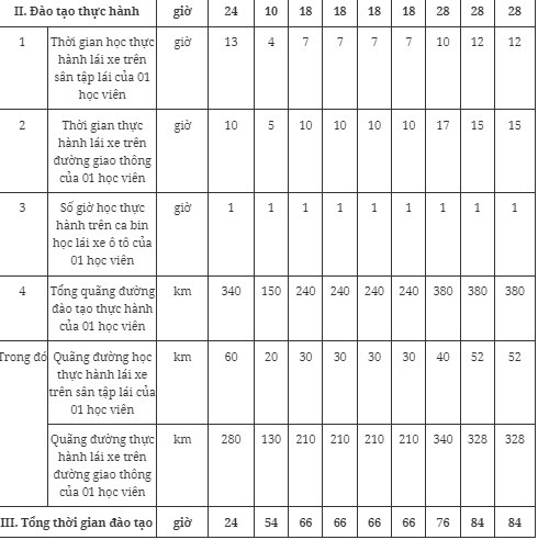 Cơ sở đào tạo lái xe căn cứ các nội dung gồm: khối lượng chương trình và phân bổ thời gian đào tạo quy định nêu trên, thời gian ôn tập, kiểm tra hết môn và nghỉ lễ; để xây dựng tổng thời gian khóa đào tạo trong chương trình đào tạo lái xe đảm bảo đạt được mục tiêu: hạng B1 chương trình đào tạo thường xuyên và đối với hạng B2, hạng C là trình độ sơ cấp;