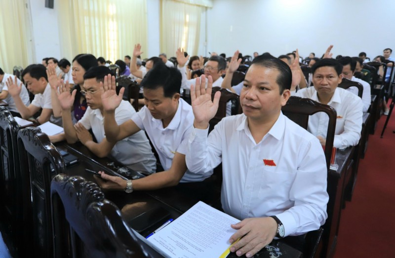 | Các đại biểu dự họp biểu quyết thông qua các Nghị quyết tại cuộc họp, trong đó có Nghị quyết về Quy hoạch tỉnh Thái Bình thời kỳ 2021 - 2030, tầm nhìn đến năm 2050. Ảnh: T.D |