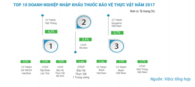 Mặt hàng thuốc bảo vệ thực vật dù Việt Nam nhập khẩu từ nhiều quốc gia khác nhau như Ấn Độ, Malaysia, Indonesia, Thái Lan, Hàn Quốc, Đức nhưng Trung Quốc vẫn là bạn hàng lớn nhất, chiếm tới 53,5% tổng giá trị của mặt hàng này mà Việt Nam nhập về ứng với 524 triệu USD. Lượng nhập khẩu thuốc bảo vệ thực vật từ Trung Quốc đang tăng nhanh trở lại kể từ năm 2016.
