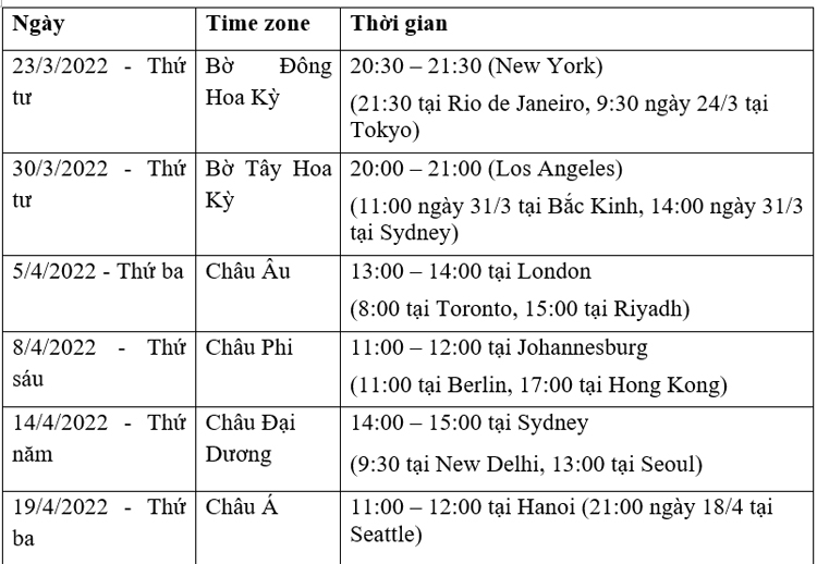 | Thời gian tổ chức các buổi hội thảo trực tuyến |