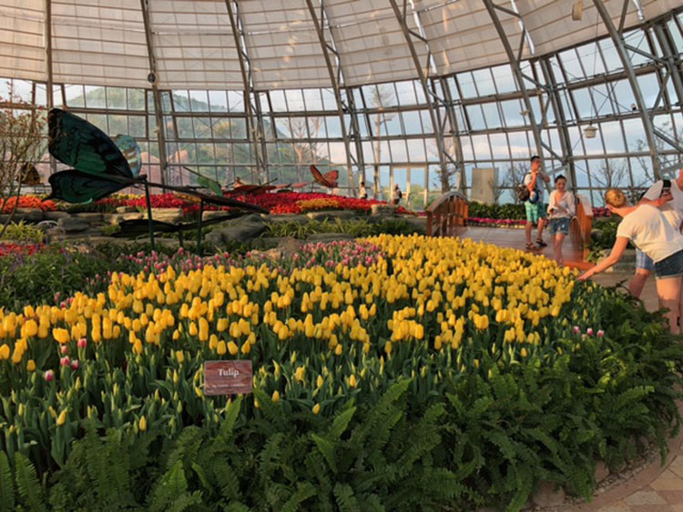 Các vạt tulip được phối màu hiện đại, hài hòa, uốn lượn tự nhiên theo kiến trúc vườn ôn đới, kết hợp với vườn ngoài trời, hồ nước, tiểu cảnh... tạo nên một thiên đường lộng lẫy và tràn đầy sắc xuân. Để đảm bảo được vẻ đẹp tươi thắm suốt tháng Tết cho thảm tulip có quy mô hơn 1.000m2 – Vinpearl Nha Trang đầu tư công phu cho môi trường và kỹ thuật chăm sóc. Toàn bộ các đoá tulip đều được trồng trong hệ thống nhà kính hiện đại với cảm biển nhiệt tự động, tránh tiếp xúc trực tiếp với ánh mặt trời, được tưới nhỏ giọt và duy trì nền nhiệt ổn định 18 độ C.