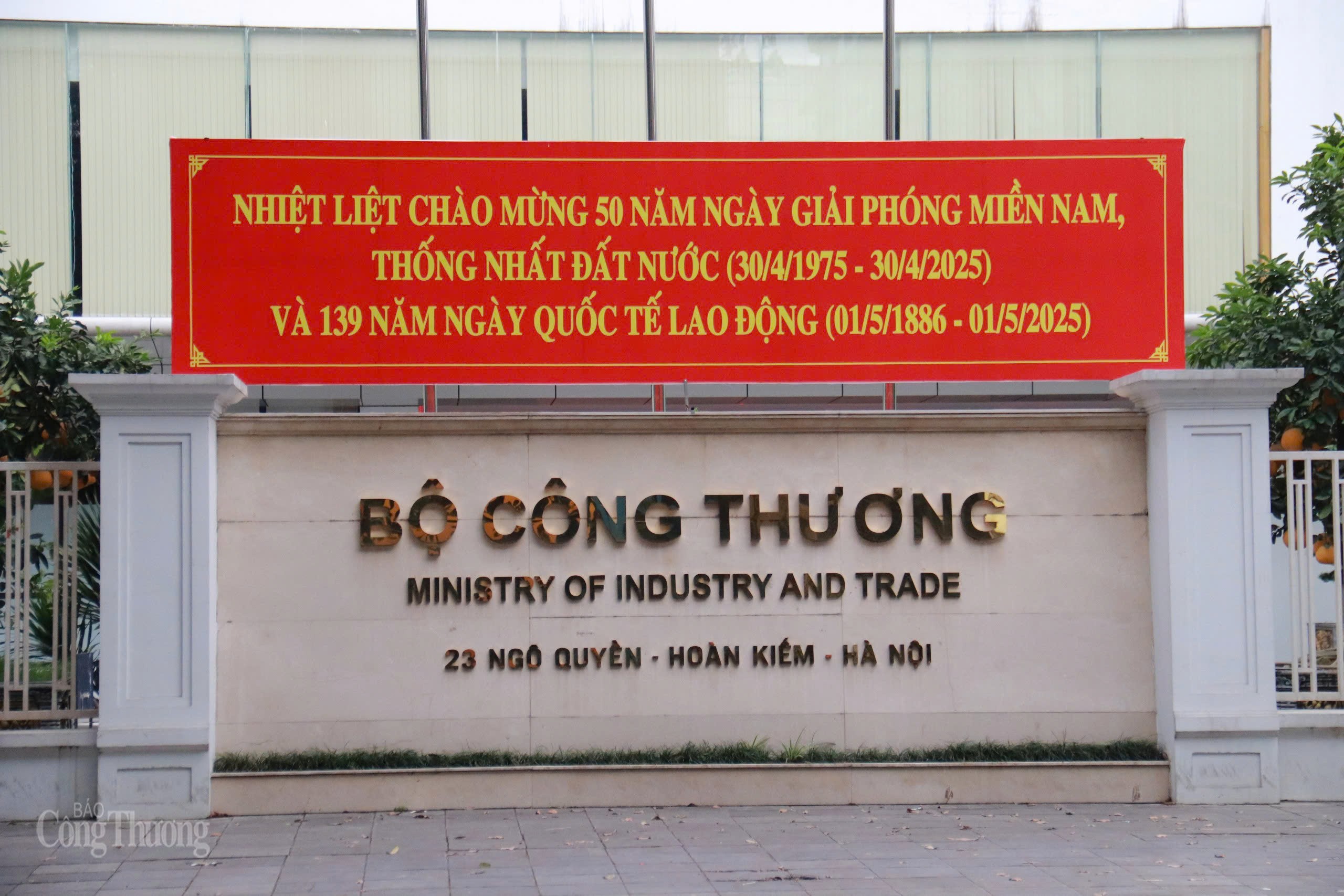 | Áp phích kỷ niệm 50 năm ngày Giải phóng miền Nam, thống nhất đất nước và 139 năm ngày Quốc tế Lao động tại trụ sở Bộ Công Thương ở 23 Ngô Quyền, Hà Nội |