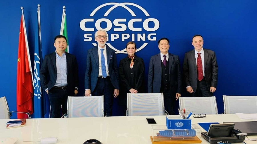 | Tham tán Công sứ, Thương vụ Việt Nam tại Italia Nguyễn Đức Thanh (bên tay phải từ thứ 2 sang) làm việc với hãng tàu Cosco về vụ 100 container hạt điều xuất sang Italia có dấu hiệu bị lừa đảo (Ảnh: Thương vụ Việt Nam tại Italia) |