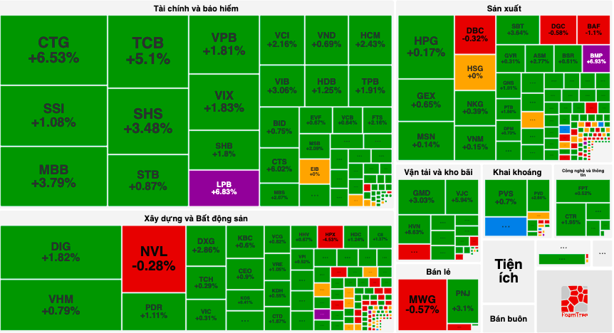 Ngoài vai trò chủ đạo là nhóm cổ phiếu nhà băng, phiên hôm nay, gần như không có nhóm ngành nào tác động tiêu cực lên chỉ số, từ bất động sản, thép cho đến bán lẻ, dầu khí, viễn thông...
