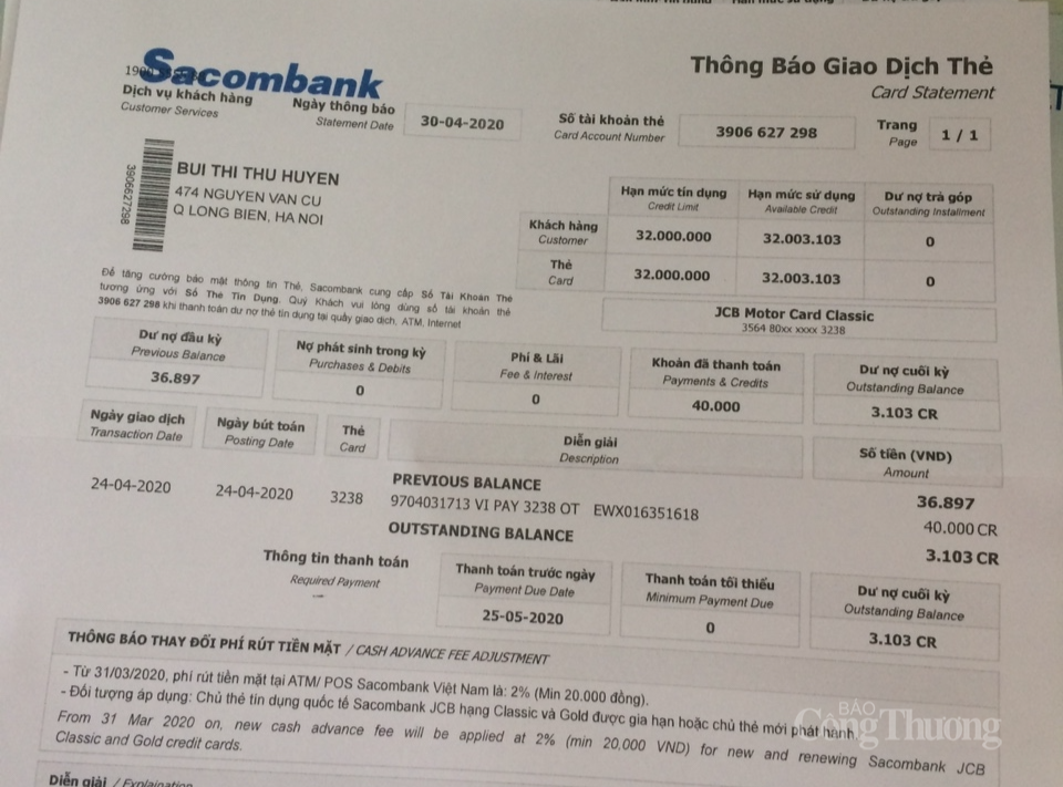 Chị Bùi Thị Thu Huyền cho biết, chị làm thẻ JCB của Ngân hàng Sacombank từ năm 2015, mở tại chi nhánh Long Biên, Hà Nội. Từ năm 2015 đến thời điểm tháng 4/2020, chị chưa từng nhận được sao kê bằng giấy gửi qua bưu điện, tuy nhiên Ngân hàng Sacombank lại chủ động trừ tiền phí gửi sao kê bằng giấy qua bưu điện từ tài khoản của chị hàng tháng mà không có bất kỳ thông báo thu phí cụ thể nào cho khách hàng.