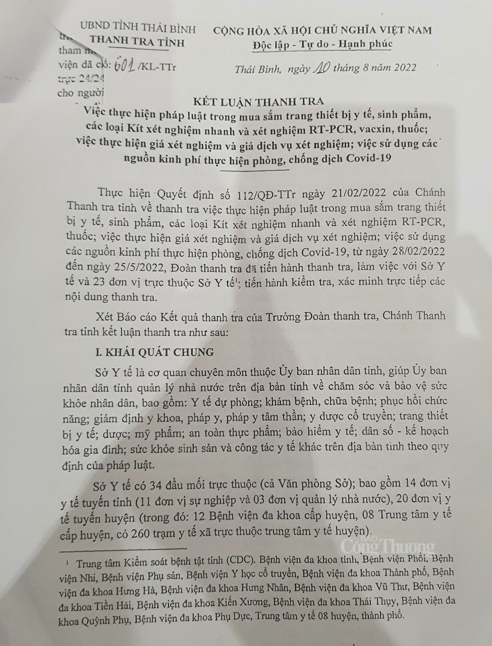 Ngày 10/8/2022, Thanh tra tỉnh tỉnh Thái Bình ban hành Kết luận thanh tra số 601/KL-TTr, chỉ ra nhiều sai phạm trong tổ chức đấu thầu, mua sắm vật tư y tế và biểu hiện vi phạm luật Luật Đấu thầu, Nghị định số 63/2014/NĐ-CP ngày 26/6/2014 của Chính phủ; Nghị quyết 07/2018/NQ-HĐND ngày 12/7/2018 của HĐND tỉnh Thái Bình.