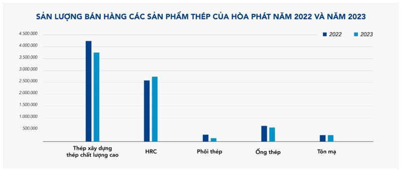 Trong đó, Thép xây dựng, thép chất lượng cao đạt 3,78 triệu tấn, giảm 11% so với cùng kỳ năm trước. Thép cuộn cán nóng HRC ghi nhận gần 2,8 triệu tấn, tăng 6% với với năm 2022. Kết thúc năm, Hòa Phát đã cung cấp 685.000 tấn ống thép, giảm 9% so với năm 2022. Tôn mạ các loại đạt tương đương năm trước đó khi đạt 329.000 tấn.