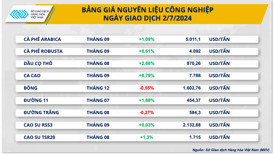 Thống kê mới nhất của Sở Giao dịch hàng hoá Việt Nam (MXV), trong phiên ngày 2/7, giá cà phê Arabica diễn biến giằng co nhưng kết phiên vẫn tăng 1,09% lên 5.011 USD/tấn. Giá cà phê Robusta cũng tăng nhẹ 0,61%, lên 4.092 USD/tấn. Triển vọng nguồn cung cà phê ở mức thấp tại Việt Nam duy trì sự hỗ trợ đối với giá Robusta.