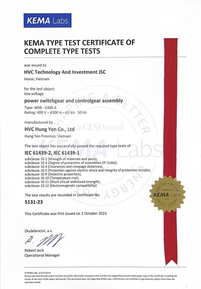 | Chứng nhận KEMA Type Test cho tủ điện hạ thế của Nhà máy HVC Hưng Yên |