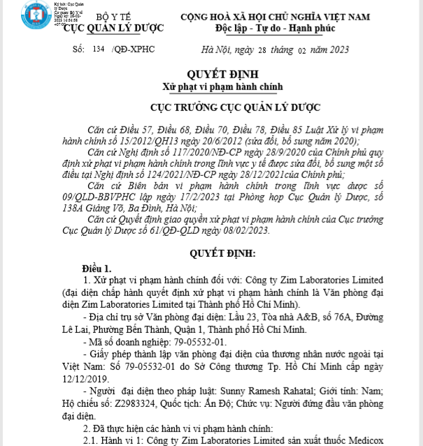 | Quyết định xử phạt của Cục Quản lý dược đối với hành vi sai phạm của Công ty Zim Laboratories Limited |