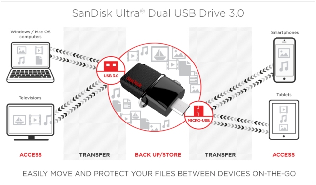 SanDisk Ultra Dual USB Drive 3.0 là lựa chọn lý tưởng cho người dùng smartphone và tablet đang tìm kiếm giải pháp để gia tăng không gian lưu trữ cũng như dễ dàng truyền tải hình ảnh, video vào máy tính cá nhân. Với dung lượng lưu trữ 128GB, người dùng thiết bị Android có thể tăng gấp đôi số lượng hình ảnh, bài hát, video và các nội dung khác mà không cần phải quan tâm đến vấn đề đầy bộ nhớ smartphone và tablet. Ngoài dung lượng lưu trữ lớn, SanDisk cũng đã cải thiện hiệu năng cổng USB 3.0 của thiết bị, giúp tốc độ di chuyển dữ liệu từ ổ nhớ sang máy tính cá nhân giờ đây có thể lên đến 150MB/s.