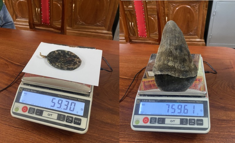 Tang vật thu giữ gồm một túi mật động vật có trọng lượng 59,3 gram (nghi mật gấu), một sừng động vật màu nâu xám, trọng lượng 759,6 gram (nghi là sừng tê giác châu Á).
