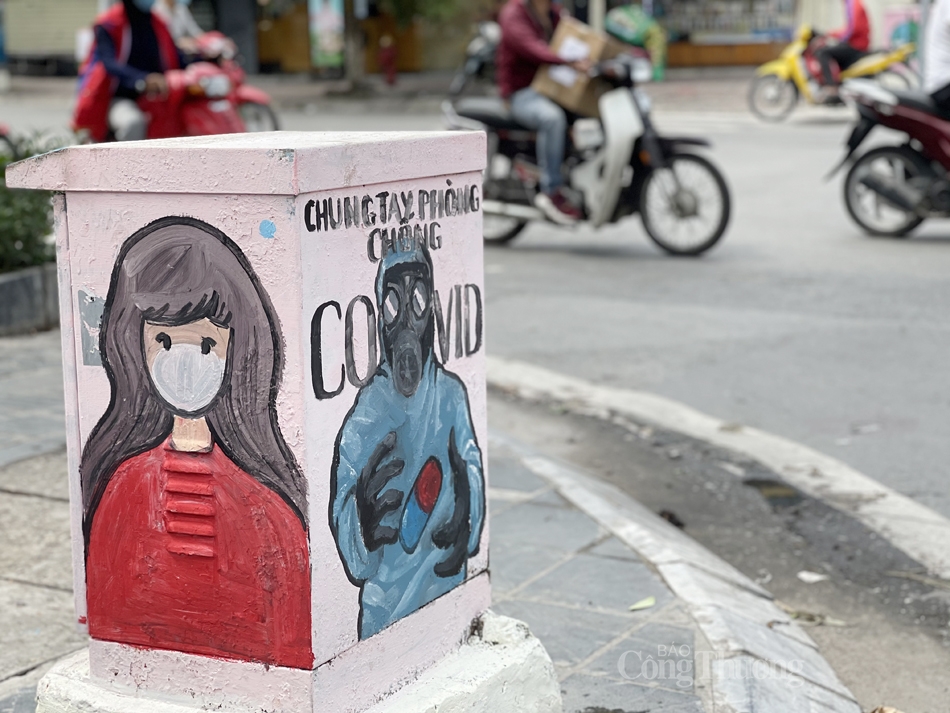 Trên nhiều tuyến phố Hà Nội như khu vực ngã tư Bạch Mai - Lê Thanh Nghị (quận Hai Bà Trưng), Quang Trung, Nguyễn Trãi (quận Hà Đông)… xuất hiện những bốt điện được vẽ hình ảnh vui tươi về đội ngũ y bác sỹ phòng chống dịch Covid-19, hình ảnh người dân đeo khẩu trang, bàn tay đẩy lùi SARS-CoV-2, rửa tay sát khuẩn...
