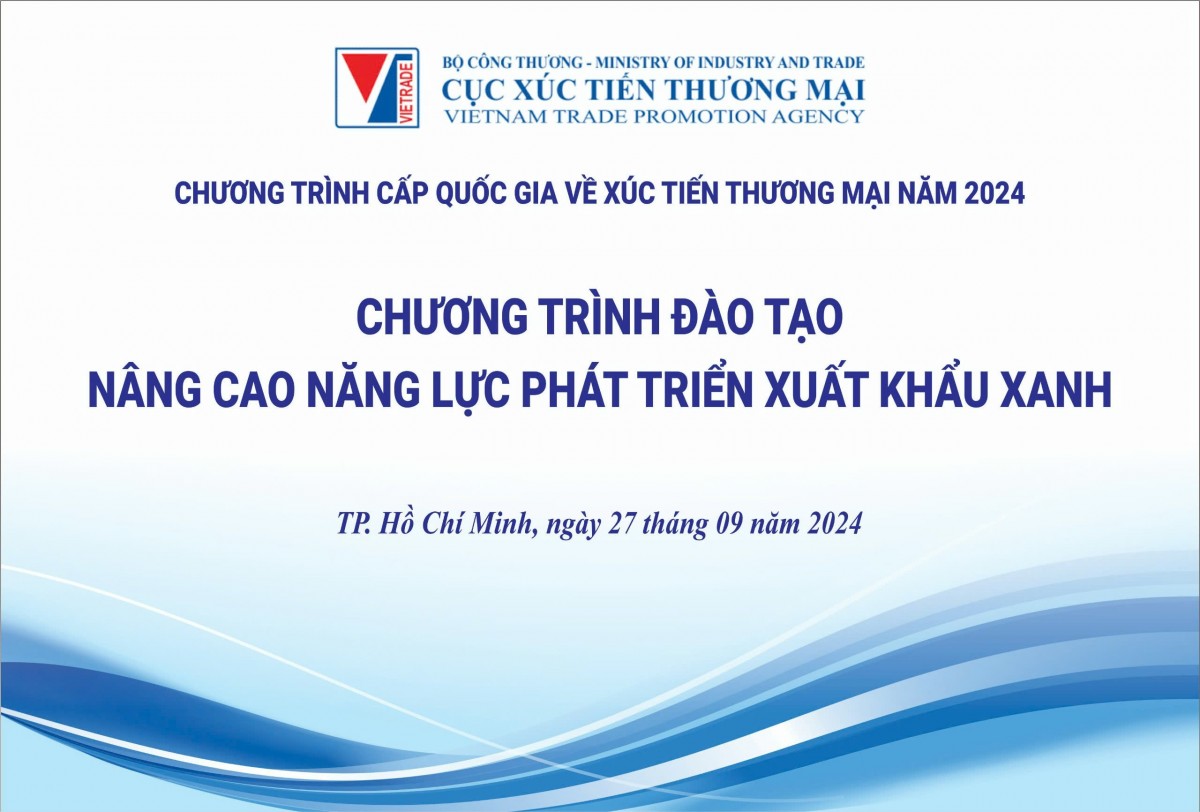 Ngày 27/9/2024, tại thành phố Hồ Chí Minh, Cục Xúc tiến thương mại (Bộ Công Thương) sẽ tổ chức Chương trình đào tạo, nâng cao năng lực phát triển xuất khẩu xanh. Đây là lớp đào tạo thứ ba thuộc chuỗi chương trình gồm 3 lớp được Cục Xúc tiến thương mại thực hiện trong khuôn khổ Chương trình Cấp quốc gia về Xúc tiến thương mại năm 2024 tại Hà Nội, thành phố Cần Thơ và thành phố Hồ Chí Minh.