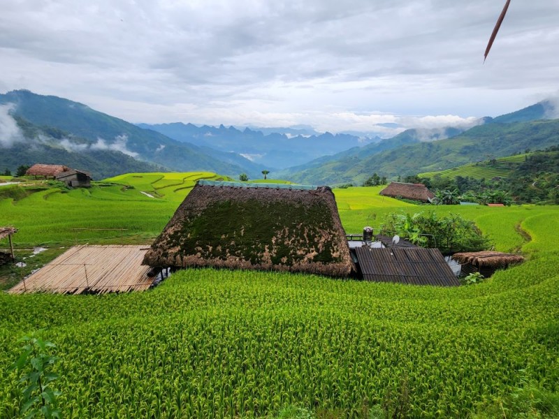 | Những ngôi nhà mái phủ rêu ẩn nấp bên những ruộng bậc thang ở Xà Phìn. Ảnh: Thu Hường |