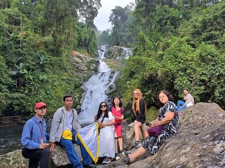 | Du khách dừng chân bên Thác Hươu. Ảnh: PT |