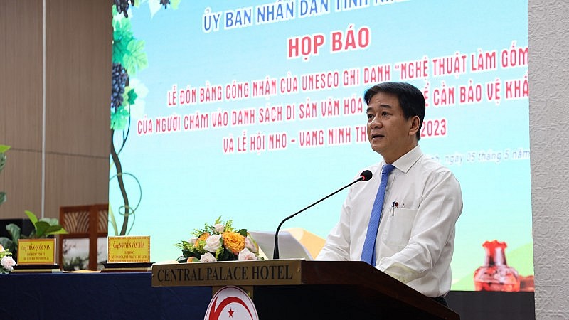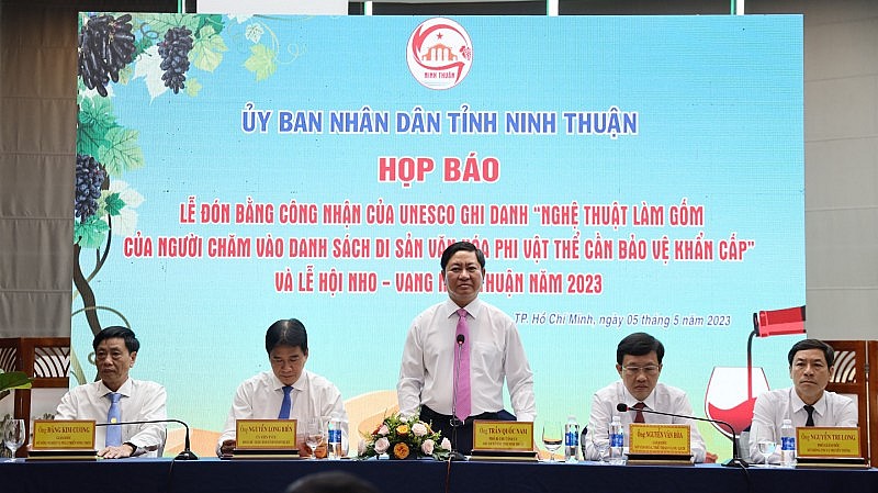 Chiều 5/5, tỉnh Ninh Thuận đã tổ chức họp báo công bố thông tin Lễ đón Bằng công nhận của UNESCO ghi danh Nghệ thuật làm gốm của người Chăm vào Danh sách Di sản Văn hóa phi vật thể cần bảo vệ khẩn cấp và Lễ hội Nho - Vang Ninh Thuận năm 2023.