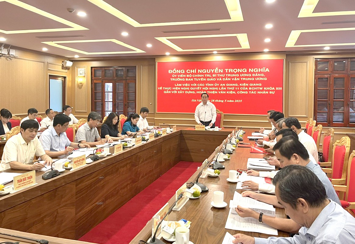 Thực hiện phân công của Bộ Chính trị, sáng 28/5, Ủy viên Bộ Chính trị, Bí thư Trung ương Đảng, Trưởng Ban Tuyên giáo và Dân vận Trung ương Nguyễn Trọng Nghĩa đã có buổi làm việc với Thường trực Tỉnh ủy hai tỉnh An Giang và Kiên Giang. Buổi làm việc nhằm quán triệt và triển khai Nghị quyết Hội nghị Trung ương 11 khóa XIII, gắn với công tác xây dựng văn kiện, chuẩn bị nhân sự Đại hội Đảng bộ nhiệm kỳ tới và phương án tổ chức lại đơn vị hành chính cấp tỉnh.