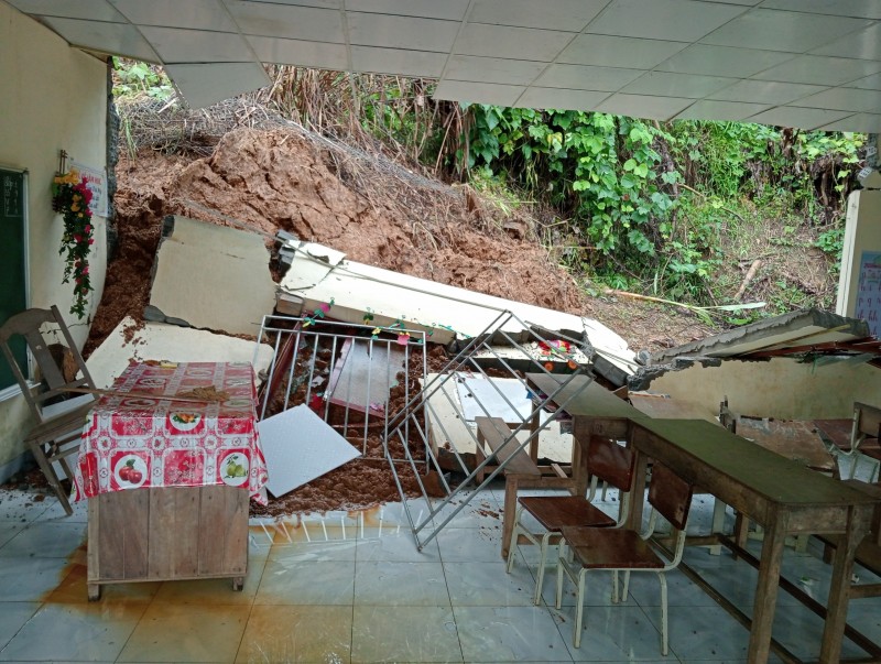 Theo đó, khoảng 23h ngày 17/11, mưa lớn khiến đất đá từ quả đồi phía sau điểm trường trút xuống khiến sập tường phòng học và gây hư hại nhiều thiết bị giảng dạy.
