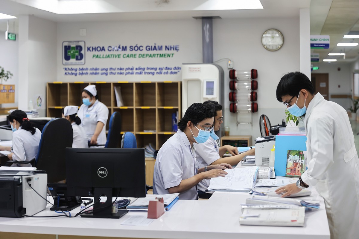 | Bác sĩ, nhân viên y tế làm việc tại khoa chăm sóc giảm nhẹ, Bệnh viện Ung Bướu TP. Hồ Chí Minh cơ sở 2 trong một ca trực. Ảnh: Quỳnh Trần |