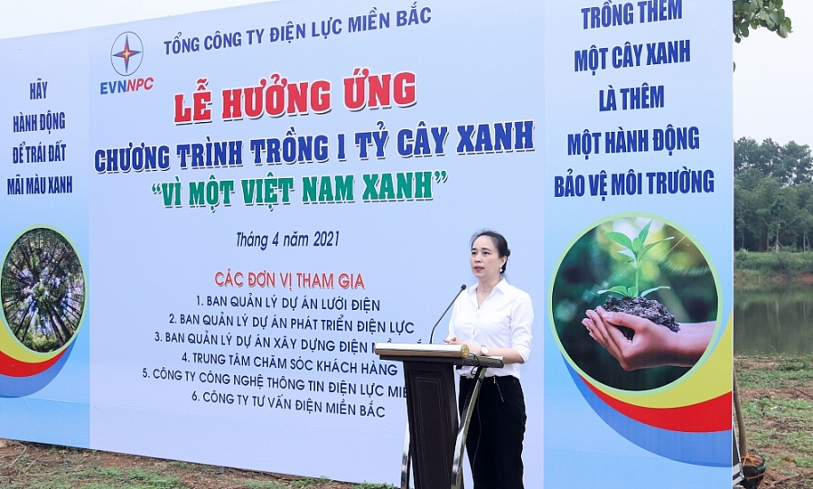 Phát biểu tại lễ phát động, bà Đỗ Nguyệt Ánh – Tổng giám đốc EVNNPC cho biết, hưởng ứng và thực hiện Chỉ thị của Thủ tướng về về tổ chức phong trào “Tết trồng cây” và tăng cường công tác bảo vệ, phát triển rừng ngay từ đầu năm 2021, trong đó có mục tiêu trồng 1 tỷ cây xanh trong từng khu dân cư với sự tham gia của mọi người dân; tập trung ở địa bàn đô thị, khu công nghiệp, khu chế xuất, khu kinh tế khác, khu dân cư tập trung, khu văn hóa - lịch sử, khu tưởng niệm, hành lang giao thông…Tổng giám đốc và Công đoàn EVNNPC đã có chỉ thị tới toàn thể cán bộ công nhân viên trong tổng công ty. Trong đó giao nhiệm vụ cho mỗi một người trồng 1 cây xanh trong năm 2021 và 10 cây xanh trong giai đoạn 2021-2030.