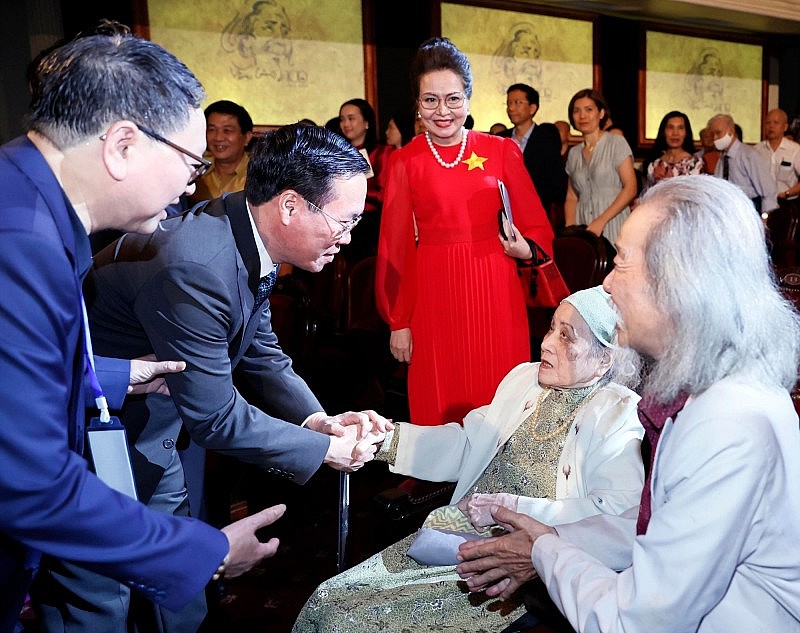 Chủ tịch nước Võ Văn Thưởng thăm hỏi bà Nghiêm Thúy Băng - vợ của nhạc sĩ Văn Cao. Ảnh: TTXVN