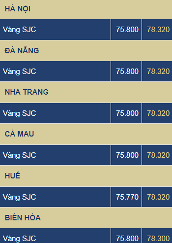 Công ty Doji TP. Hồ Chí Minh cũng niêm yết giá vàng SJC ở mức 75,95-78,25 triệu đồng/lượng mua vào - bán ra, giảm 300 ngàn đồng/lượng chiều mua vào và giảm 400 ngàn đồng/lượng chiều bán ra so với ngày hôm qua.