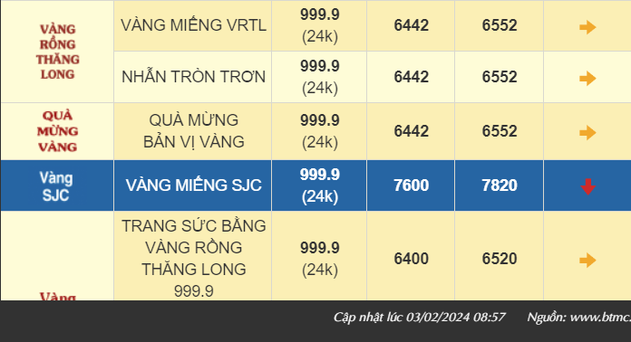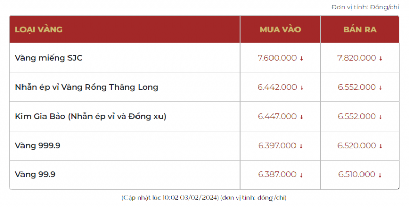 Thời điểm trưa ngày 3/2/2024, giá vàng SJC tại Công ty Doji Hà Nội giao dịch ở mức 75,95-78,25 triệu đồng/lượng mua vào - bán ra, giảm 300 ngàn đồng/lượng chiều mua vào và giảm 400 ngàn đồng/lượng chiều bán ra so với ngày hôm qua.