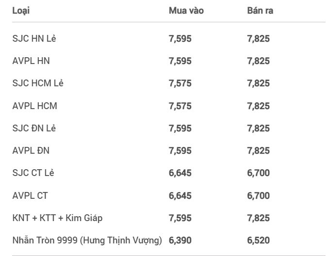 Vàng SJC tại Công ty Vàng bạc đá quý Sài Gòn hiện đang giao dịch từ 75,80-78,32 triệu đồng/lượng, giảm 600 ngàn đồng/lượng chiều mua vào và giảm 380 ngàn đồng/lượng chiều bán ra so với ngày hôm qua. Tương tự, Công ty Vàng bạc Phú Quý giao dịch ở mức 75,95-78,25 triệu đồng/lượng, giảm 500 ngàn đồng/lượng chiều mua vào và giảm 400 ngàn đồng/lượng chiều bán ra so với ngày hôm qua.