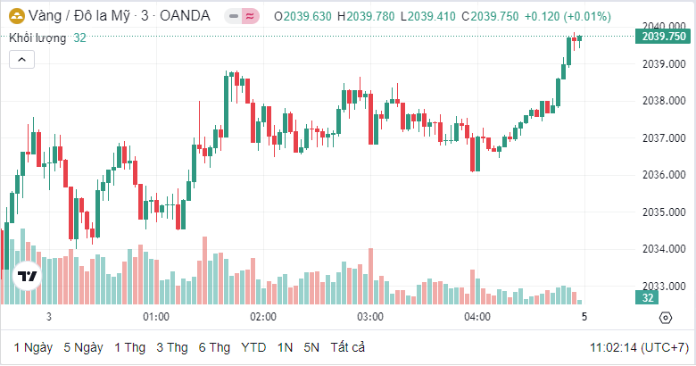 Trên thị trường thế giới, giá vàng thế giới giao ngay ở ngưỡng 2.039 USD/ounce, giảm mạnh hơn 15 USD/ounce so với giao dịch cùng thời điểm này sáng qua.