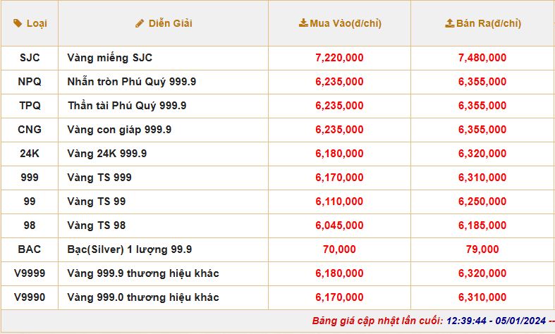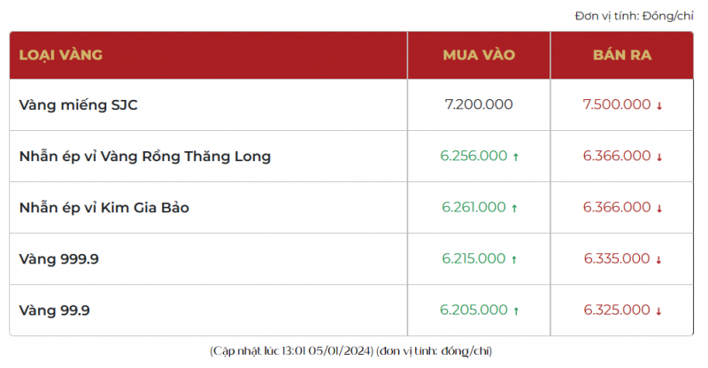 Tính đến đầu giờ chiều ngày 5/1/2024, giá vàng SJC tại Công ty Doji Hà Nội giao dịch ở mức 72,00-75,00 triệu đồng/lượng mua vào - bán ra, 100 ngàn đồng/lượng chiều mua vào và bằng giá chiều bán ra so với ngày hôm qua. Chênh lệch giữa mua và bán là 3 triệu đồng/lượng.