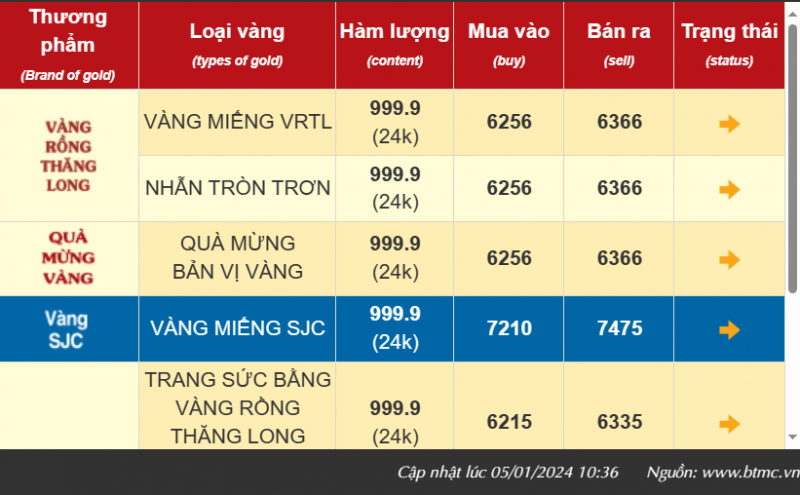 Vàng trang sức bằng Vàng rồng Thăng Long 999.9 (vàng 24k) của Công ty TNHH Bảo Tín Minh Châu giao dịch quanh mức 62,56 - 63,66 triệu đồng/lượng mua vào - bán ra, tăng 150 ngàn đồng/lượng chiều mua vào và tăng 150 ngàn đồng/lượng chiều bán ra so với hôm qua. Vàng trang sức bằng Vàng rồng Thăng Long 999.9 (vàng 24k) đang giao dịch quanh mức 62,15 - 63,35 triệu đồng/lượng mua vào - bán ra, giảm 160 ngàn đồng chiều mua vào và giảm 130 ngàn đồng chiều bán ra so với ngày hôm qua.