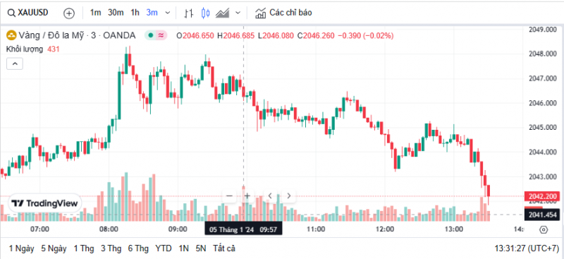 Tính đến 13 giờ ngày 5/1 (giờ Việt Nam), giá vàng thế giới giảm 3 USD so kết phiên giao dịch hôm qua, hiện ở mức 2,042 USD/ounce. Vàng tương lai tháng 2 giao dịch lần cuối ở mức 2.051,8 USD/ounce, tăng 1,8 USD.