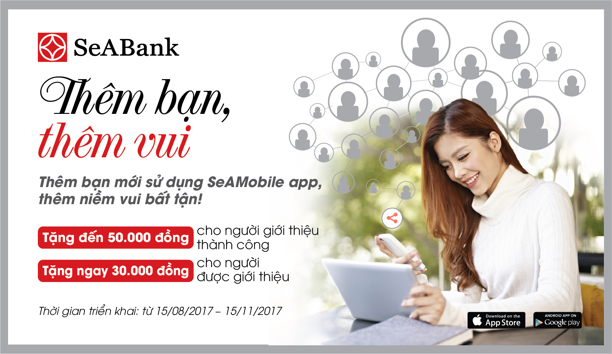 Cách thức tham gia chương trình rất đơn giản: Người giới thiệu chỉ cần đăng nhập SeAMobile App, biểu tượng “Share”, chọn phương thức giới thiệu: SMS hoặc email và nhập thông tin của người thân, bạn bè để giới thiệu dịch vụ SeANet, SeAMobile; sau đó người được giới thiệu nhận SMS/email giới thiệu, tới quầy giao dịch SeABank hoặc gọi tổng đài để đăng ký sử dụng SeANet, tải và đăng nhập SeAMobile App. Theo đó, người giới thiệu sẽ dễ dàng nhận giải thưởng lên tới 50.000 đồng cho mỗi lần giới thiệu thành công và người được giới thiệu cũng sẽ được nhận ngay 30.000 đồng.