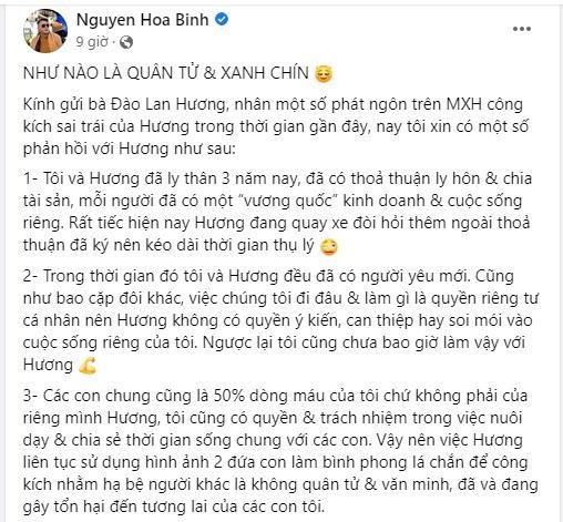 Anh viết: “Như nào là quân tử và xanh chín. Kính gửi bà Đào Lan Hương, nhân một số phát ngôn trên mạng xã hội công kích sai trái của Hương trong thời gian gần đây, nay tôi xin có một số phản hồi với Hương như sau: