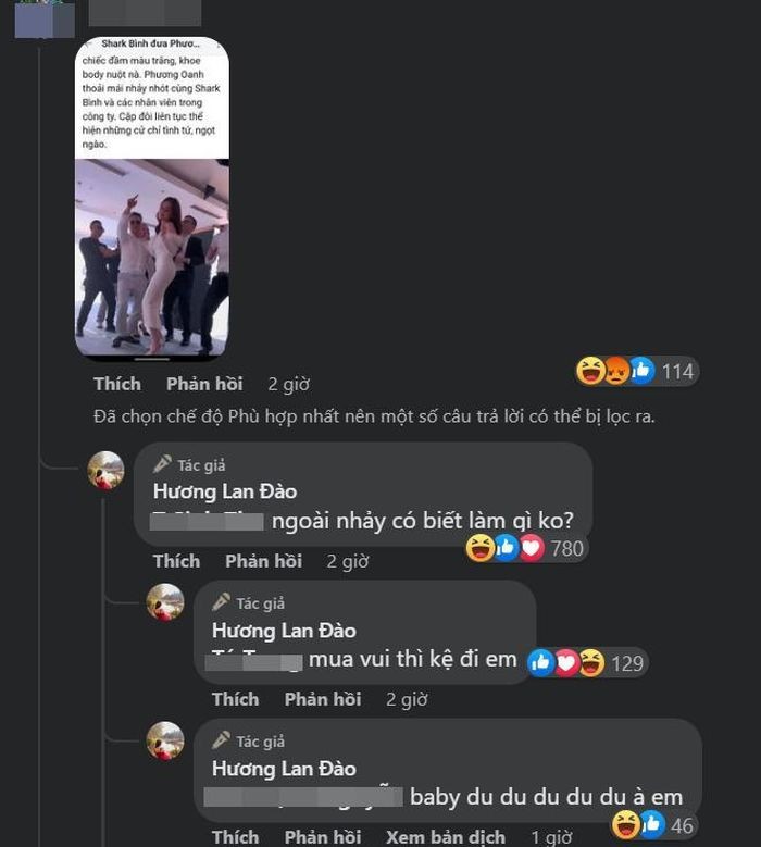 Mới đây, Shark Bình vừa có màn quẩy cực sung cùng tình mới Phương Oanh tại sự kiện tiệc cuối năm của công ty và lập tức gây xôn xao dư luận. Không chỉ bàn tán về khoảnh khắc tình tứ giữa Shark Bình và Phương Oanh, netizen còn nhanh nhảu gửi ảnh của cặp đôi cho bà Đào Lan Hương để cập nhật. Ngay sau đó, nữ doanh nhân đã nói một câu cực gắt: "Ngoài nhảy có biết làm gì không?". Ngoài ra, vợ Shark còn khẳng định: "Mua vui thì kệ đi em".