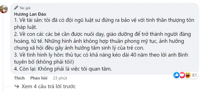 “Về tình hình ly hôn thủ tục có khả năng kéo dài 40 năm theo lời anh Bình tuyên bố, chứ không phải tôi! Còn những vấn đề khác, không phải là việc tôi quan tâm” - Đào Lan Hương phản hồi bình luận của cộng đồng mạng sau khi liên tục bị nhắc tên.