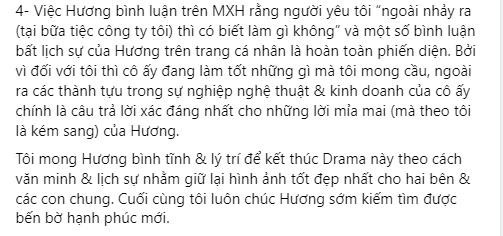 Tôi mong Hương bình tĩnh và lý trí để kết thúc drama này theo cách văn minh và lịch sự nhằm giữ lại hình ảnh tốt đẹp nhất cho hai bên và các con chung. Cuối cùng tôi luôn chúc Hương sớm kiếm tìm được bến bờ hạnh phúc mới”.