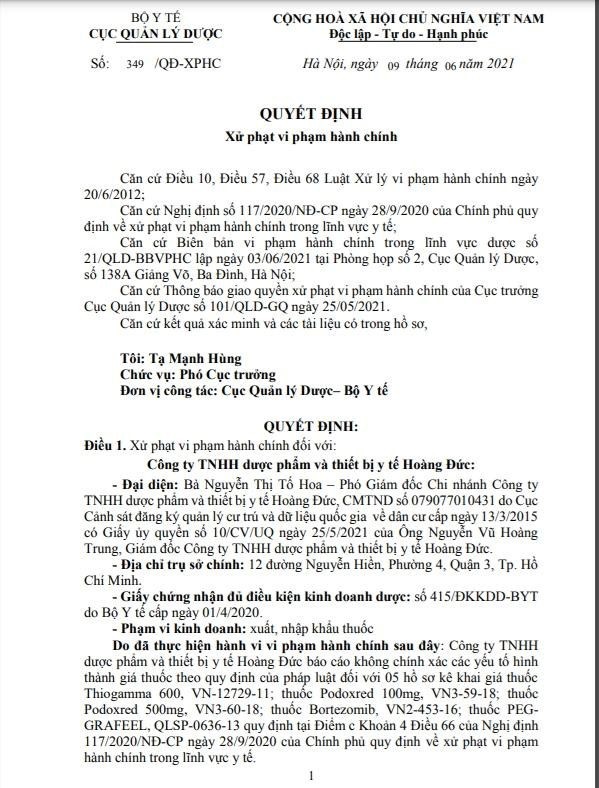 Theo quyết định xử phạt, Công ty Hoàng Đức đã có hành vi báo cáo không chính xác các yếu tố hình thành giá thuốc theo quy định của pháp luật đối với 5 hồ sơ kê khai giá thuốc Thiogamma 600, VN-12729-11; thuốc Podoxred 100mg, VN3-59-18; thuốc Podoxred 500mg, VN3-60-18; thuốc Bortezomib, VN2-453-16 và thuốc PEGGRAFEEL, QLSP-0636-13 quy định tại Điểm c Khoản 4 Điều 66 của Nghị định 117/2020/NĐ-CP ngày 28/9/2020 của Chính phủ quy định về xử phạt vi phạm hành chính trong lĩnh vực y tế. Với hành vi vi phạm này, công ty bị xử phạt hành chính 100 triệu đồng.